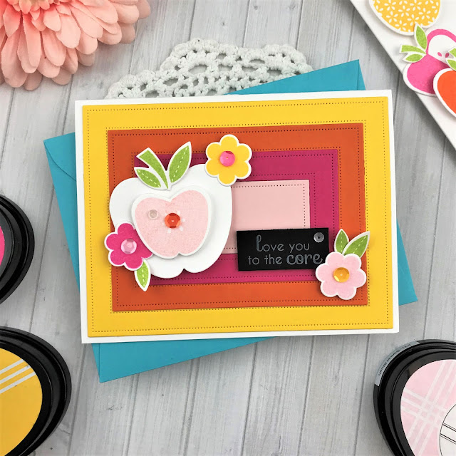 I've listed all of the colors I used for the flowers below. After they were all stamped and die-cut, I placed them on the Aqua frame until I had them right where I wanted and then adhered them. I popped some of them up with dimensional foam and others I attached directly to the frame.