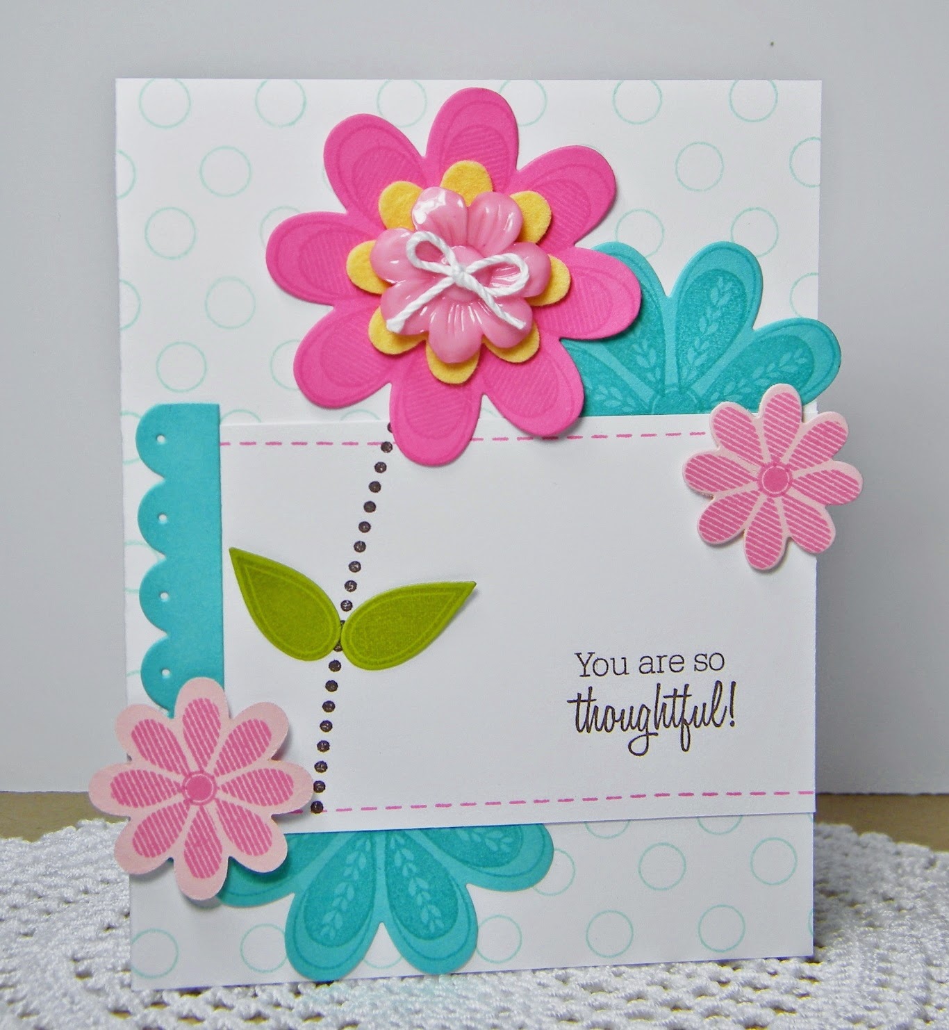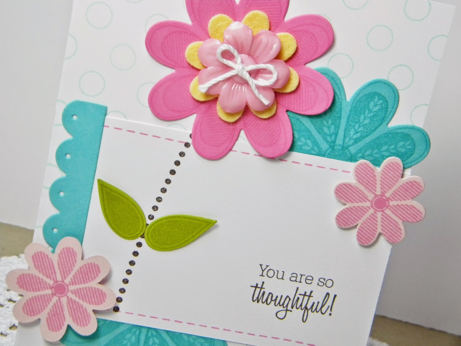I used pretty much the same design on this next card, just added a few different elements. I used Simply You for my sentiment. The bottom of my white was stamped in Aqua Mist, again using the Background Basics: Gingham stamp set.