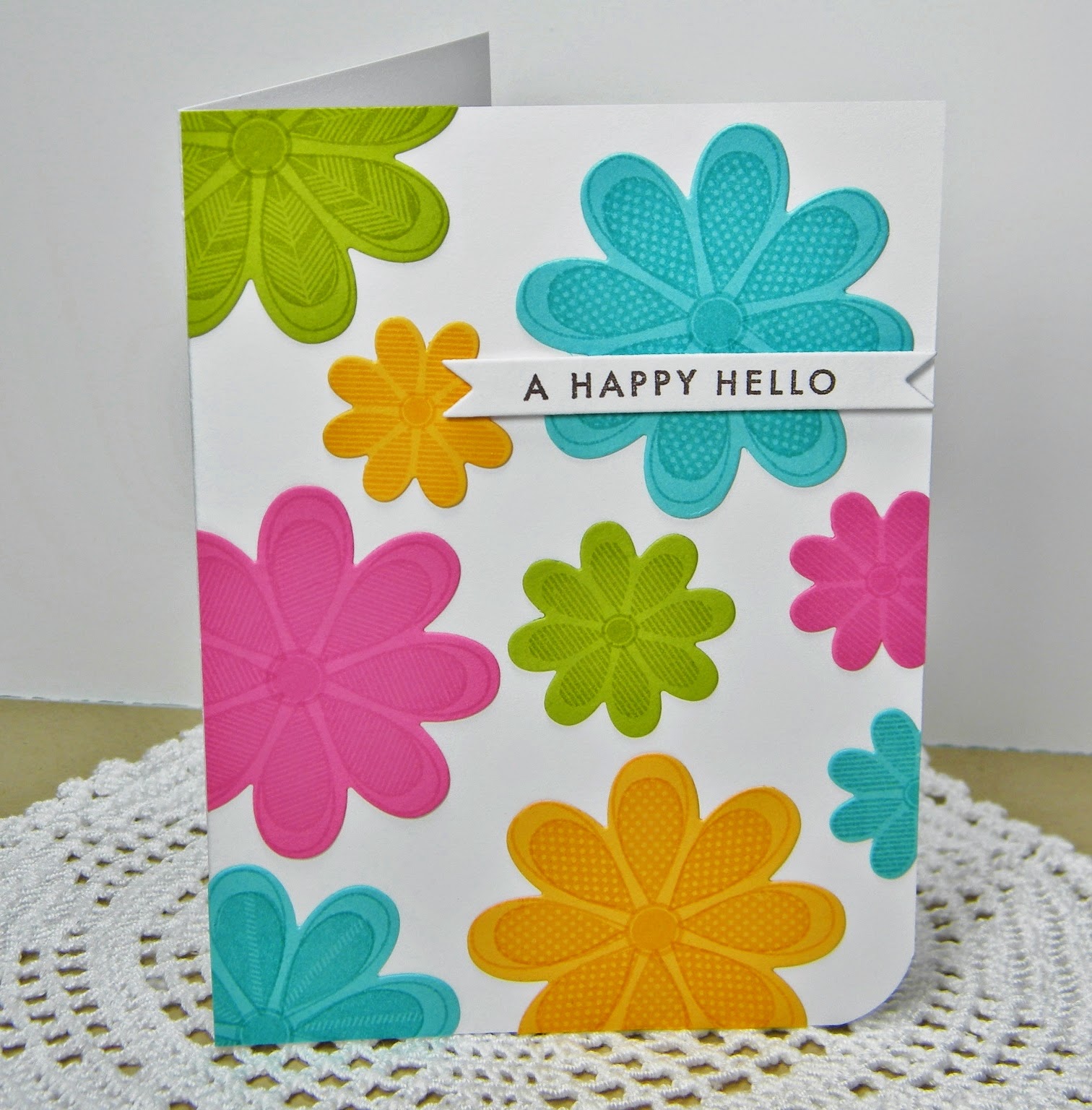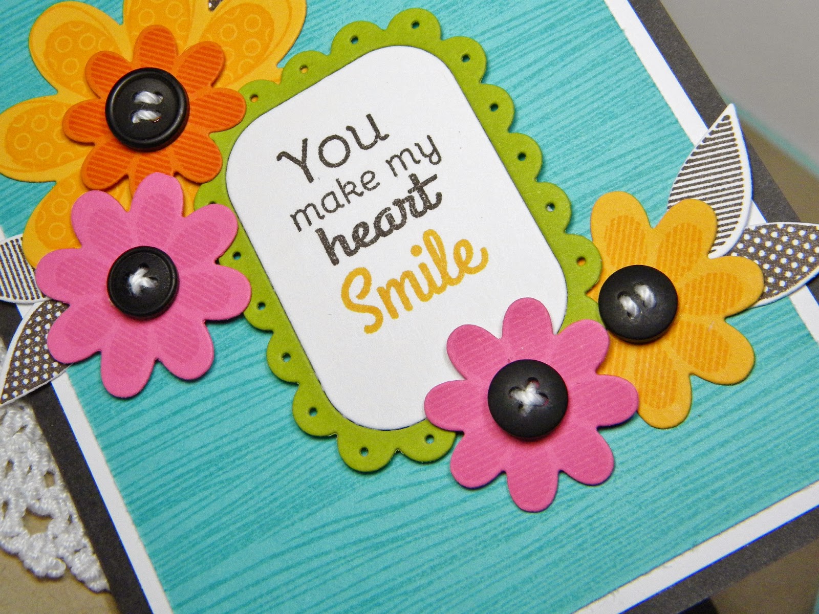 My large flowers were folded in half and then a smaller flower was added over the top with a Simply Chartreuse button. A few die cut leaves were added as well as a strip of glitter underneath my flowers.