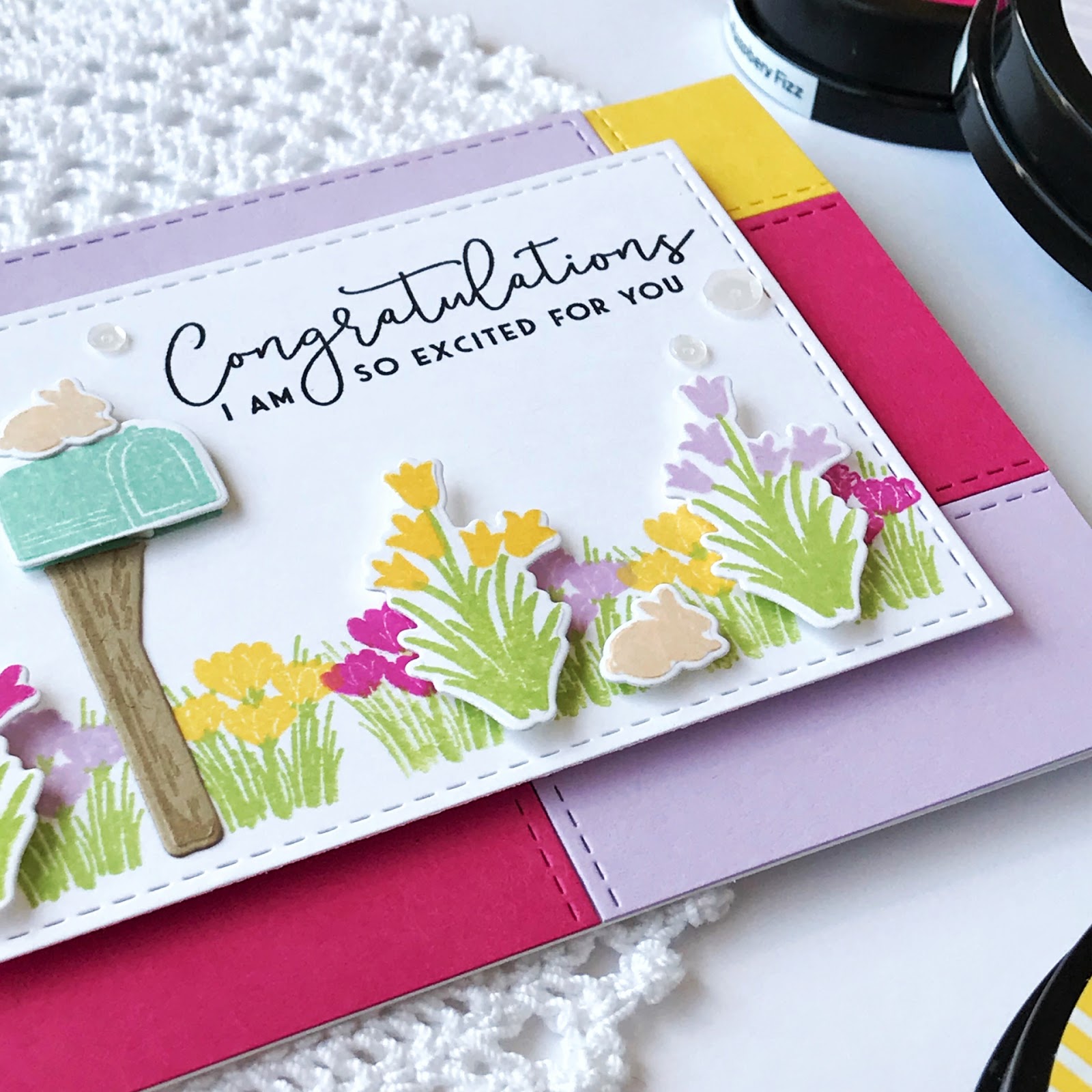 I used one of the larger rectangles to create a base for my Fence Line Spring images to sit on. Some of my flowers were stamped directly onto the white and some were stamped and die-cut separately and then popped up with dimensional foam.