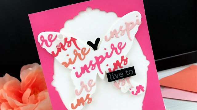 I love the Butterfly Folk Collection and used that as the focal point on my card. I die-cut a large white butterfly and on top of that I attached the word inspire in a few different colors. That was die-cut using the Words to Live By: Inspire Die