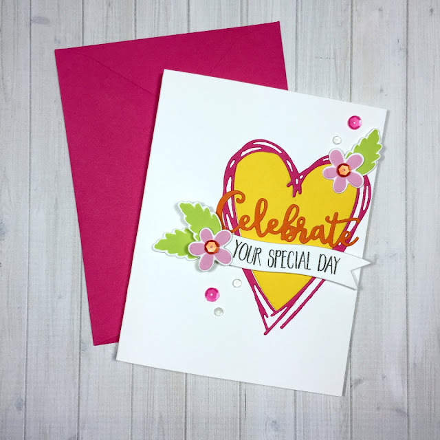 I die cut 'Celebrate' in orange and attached that to the front of the heart. I then die cut the banner, from the Sweet Celebration die collection, and stamped the rest of the sentiment before attaching it with dimensional foam. I finished this card off off with a few stamped flowers, leaves and sequins.